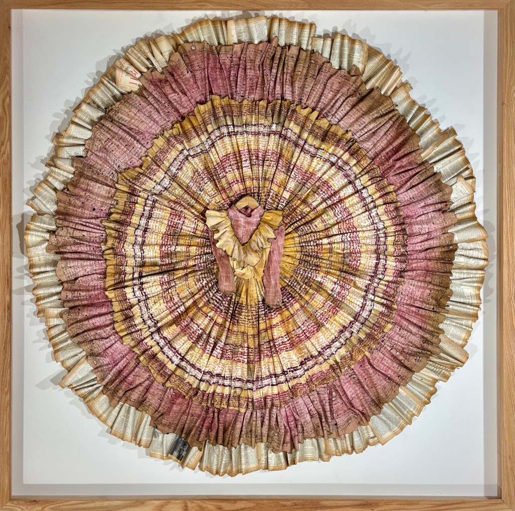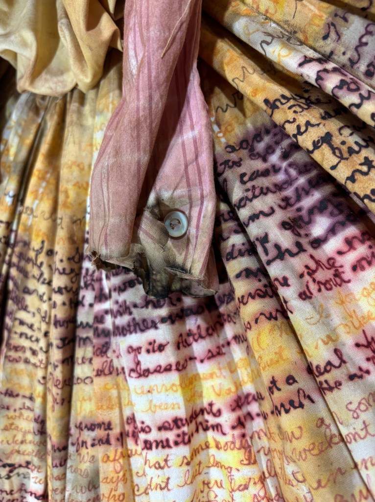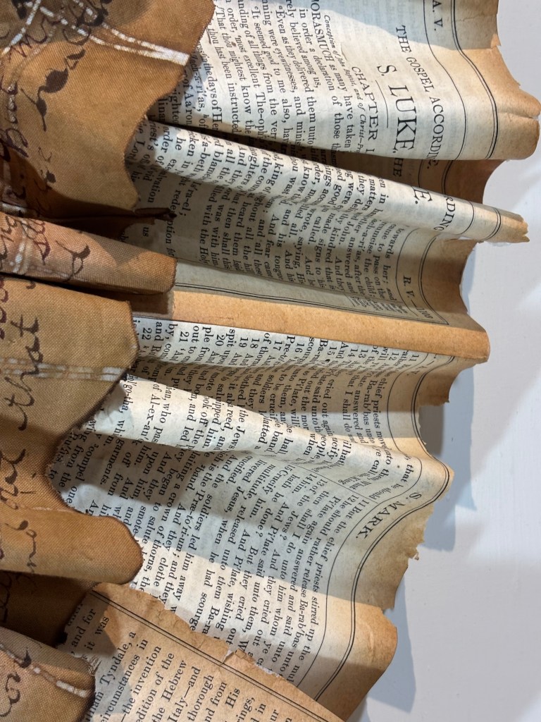 Bazoline’s dress is made from cotton fabric, an old bible, and a blouse. The edges of the fabric are singed with fire, suggesting a pheonix rising from adversity. The patterns and lines of the fabric are drawn with melted wax and chalk. A tiny bodice lies at the center of the dress, radiating the text of her words outward. The text consists of interviews and journals: words from Bazoline. Her words are marked, inked, and stained into the dress. Bazoline’s dress is supported and uplifted by the Bible, whose pages create the outermost layer of the dress. The entire work rests inside an oak frame, representing the structure and foundation Bazoline provided for those around her.